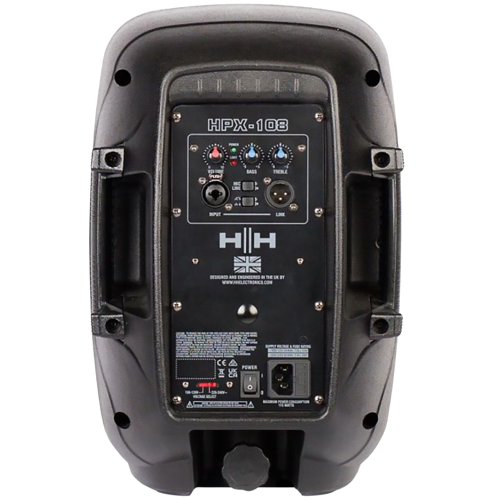The HH HPX-108 is the most compact model in the HPX active range – a portable 2 way loudspeaker built for small events, presentations and monitors. With a custom 8 inch woofer, 1 inch compression driver and 300W peak amplifier, it delivers clear speech and music in a lightweight cabinet that’s easy to carry and set up.